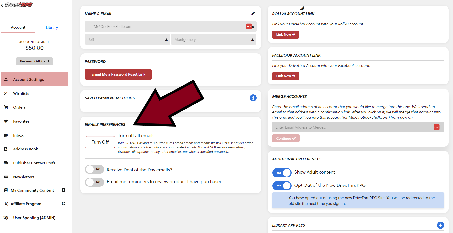 4. Busque la sección Preferencias de correo electrónico en la columna central y establezca sus selecciones para todos los correos electrónicos, los correos electrónicos de la Oferta del día y los Recordatorios de revisión de productos.